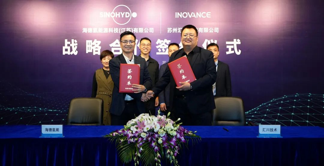 海德氫能總經(jīng)理姚昌晟、匯川技術(shù)能源SBU總監(jiān)郭立鵬分別代表雙方出席了簽約儀式并在現(xiàn)場(chǎng)簽約。