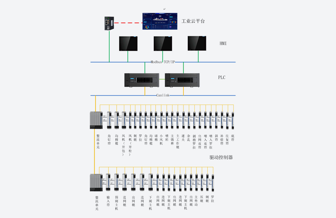 針刺線系統解決方案采用H3U+MD810的方案,采用CAN總線來連接。系統整體解決方案提高現場的設備的穩定性,抗干擾性更強。同時,采用共直流母線的電氣設計方案,實現梳理機的不斷網,一鍵啟動等功能。兼容遠程物聯網功能,實現遠程的設備調試,降低了設備的調試周期,提升維護性。